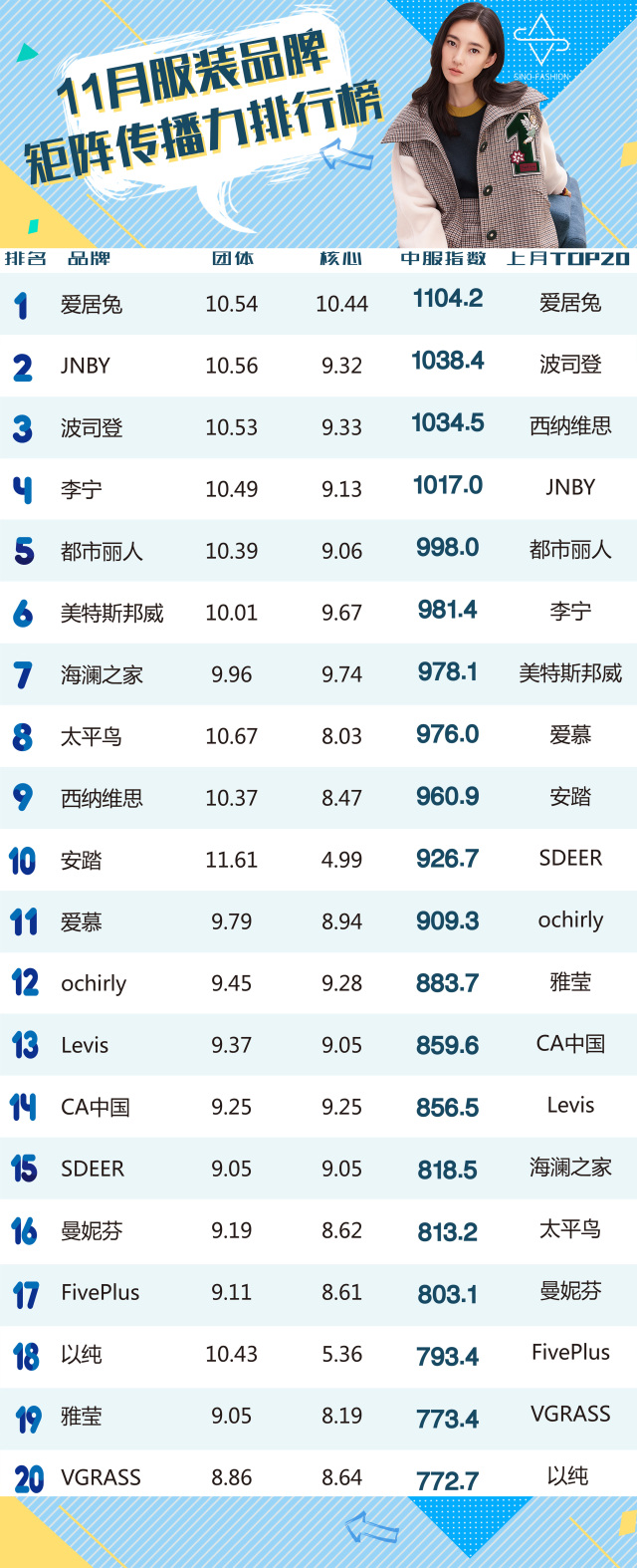 TOP20中,女装品牌有6个、运动品牌有2个、男装品牌有1个、时尚休闲品牌有7个、内衣品牌有3个、羽绒服品牌有1个。