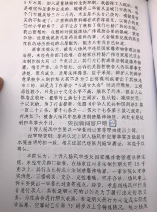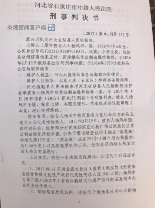 杨风申是非物质文化遗产五道古火会的传承人,曾因制作火会烟花表演所需的烟火药,被赵县人民法院以非法制造爆炸物罪判处有期徒刑四年零六个月。杨风申及家人不服判决,认为自己制作的烟火药是为了传承非物质文化遗产,且没有造成社会危害,并不违法,向石家庄市中级人民法院提起上诉。今日,二审宣判杨风申犯非法制造爆炸物罪,免予刑事处罚,杨风申老人和家人一年多的等待终于尘埃落定。