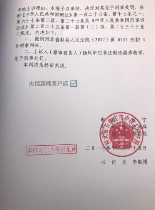 今天上午十点,石家庄市中级人民法院依法对“杨风申犯非法制造爆炸物罪”一案进行宣判,判决杨风申犯非法制造爆炸物罪,免予刑事处罚。