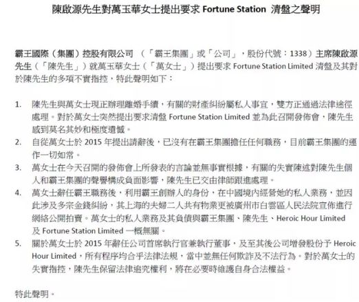 随后,霸王集团董事长陈启源发表声明,称两人正在办理离婚手续,对此事感到莫名其妙、极度遗憾。声明还称,万玉华辞任霸王集团执行董事及首席执行官职位后,仍利用霸王创始人的身份,在中国境内经营其私人业务,并因此涉及多宗金钱纠纷。