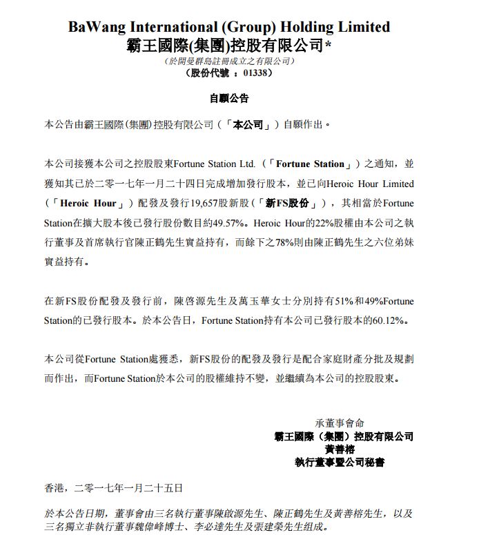 今年1月,持有霸王集团已发行股本60.12%的控股公司Fortune Station Limited向Heroic Hour(七名子女持有的公司)配发1.9万股新股。其中,二人长子陈正鹤拥有后者22%股权,同时作为受托人为6名未满18岁的弟妹持有其余78%的股本。