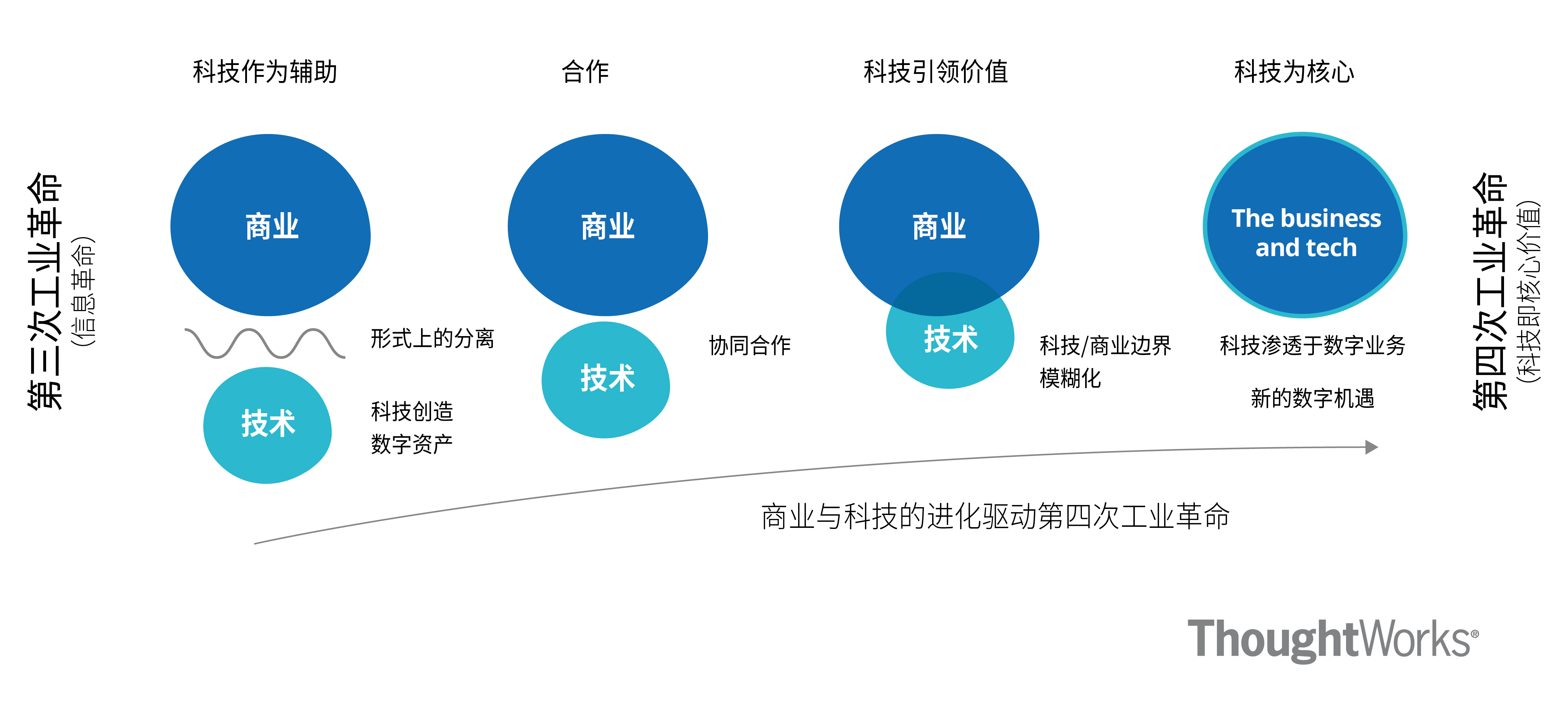 随着市场机会越来越多地依赖科技,商业领袖与技术专家开始了更紧密地合作,继而愈加将其视为交付差异化服务和产品的合作伙伴。敏捷交付技术开始被广泛采纳,以市场为中心的产品开发团队也在采用市场反馈技术(Market Responsive Techniques),如以用户为中心的设计和精益创业思维。这种产品团队级别的合作正是从第三次转向第四次工业革命的开端。