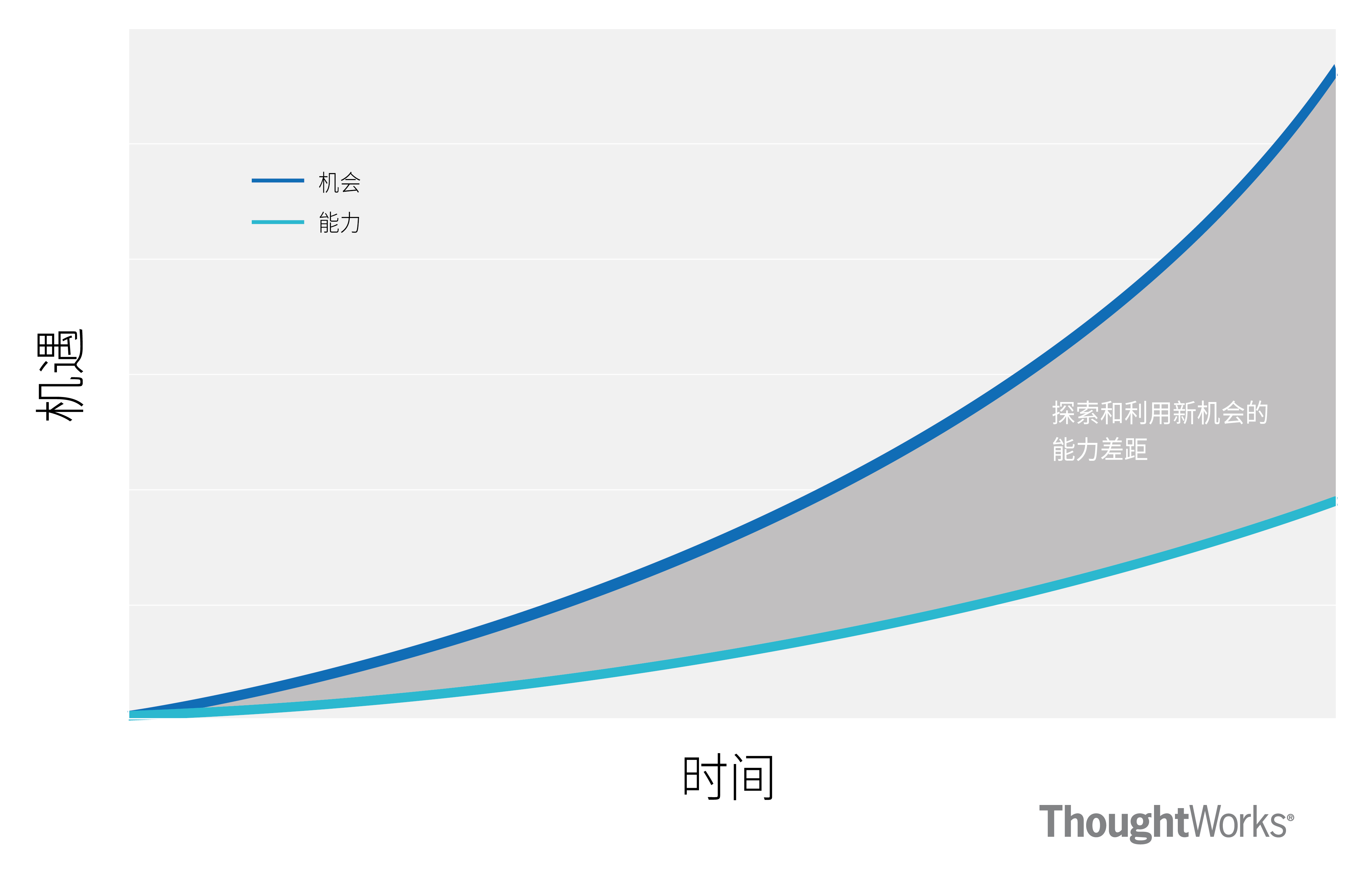 在这两种不同类型的组织之间,吸收新技术的能力差距会自然浮现。组织越是陈旧,与业务越是深度绑定,两者之间的差距就会越大,并且随着技术发展的不断加速(别忘了摩尔定律),颠覆者可用的工具与成熟企业采用的技术之间的差距可能会进一步变大。需要指出的是,在观察不同企业如何灵活应对新出现的市场机遇时,相似的差距同样会出现。当一个组织越来越重视业绩优化时,其迅速转向新市场机会的能力就越弱。