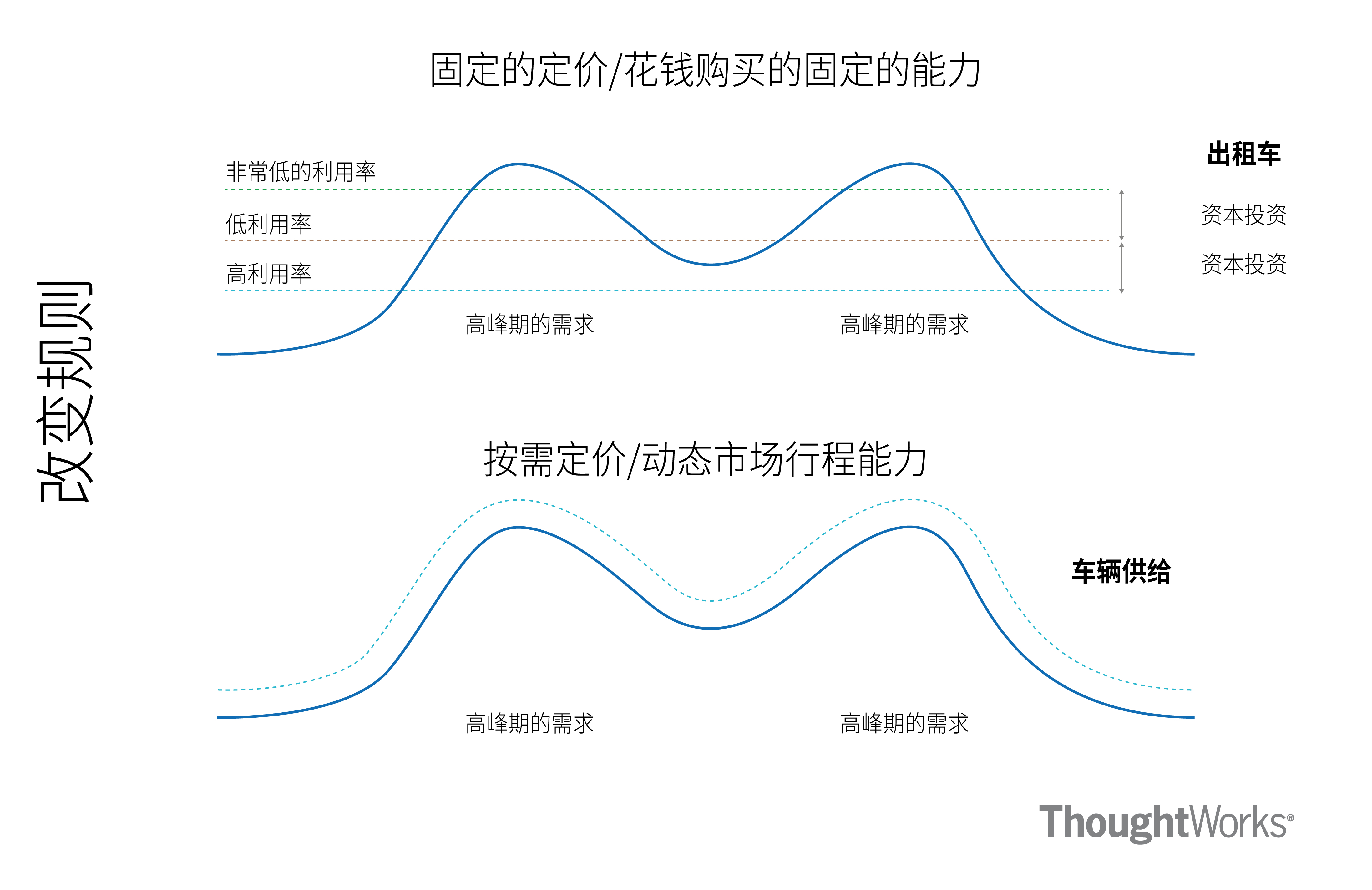 在Uber,Garrett Camp和Travis Kalanick是在一系列截然不同的运营约束下,通过构建全新的业务生态系统来做到这一点的。例如,Uber将可变定价和按需能力相结合,根据行程需求的起伏自动调整定价,而不用受困于花大价钱购买和维护的固定运载能力。通过这种机制,Uber在交通高峰期可以拥有更多的车辆上路,同时还避免了在低谷期为未使用的资源付费。