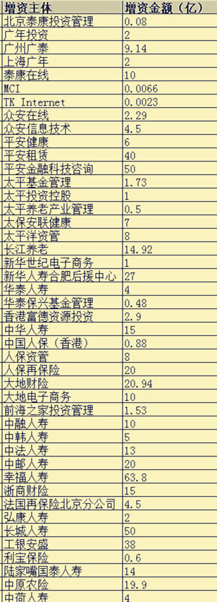 从参与增资的资本方来说,泰康保险集团及子公司参与最多的公司。泰康保险集团及旗下泰康资管和泰康人寿今年一共发起了7项增资计划,合计增资金额约24亿元。其中泰康在线独占10亿元,泰康方面表示,增资为了满足偿付能力和防范流动性风险等需求,有利于提升市场竞争力。
