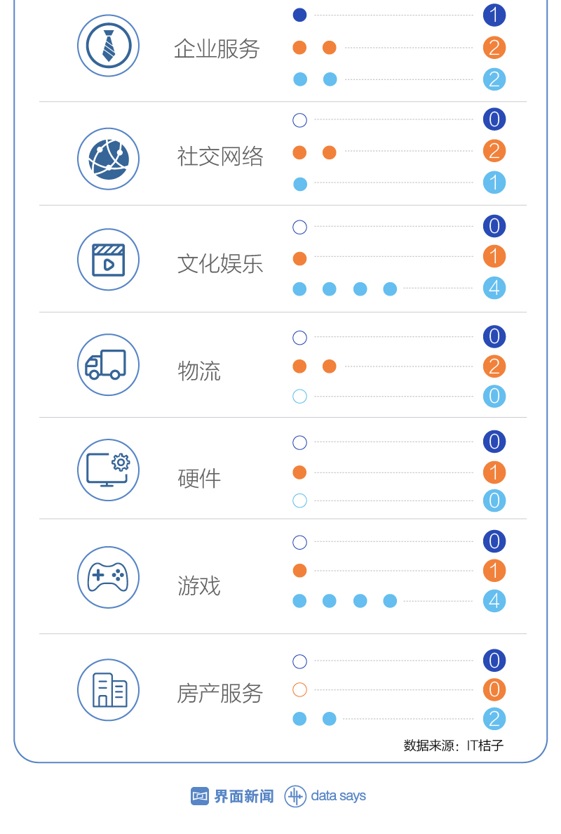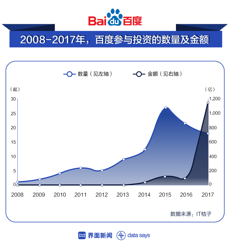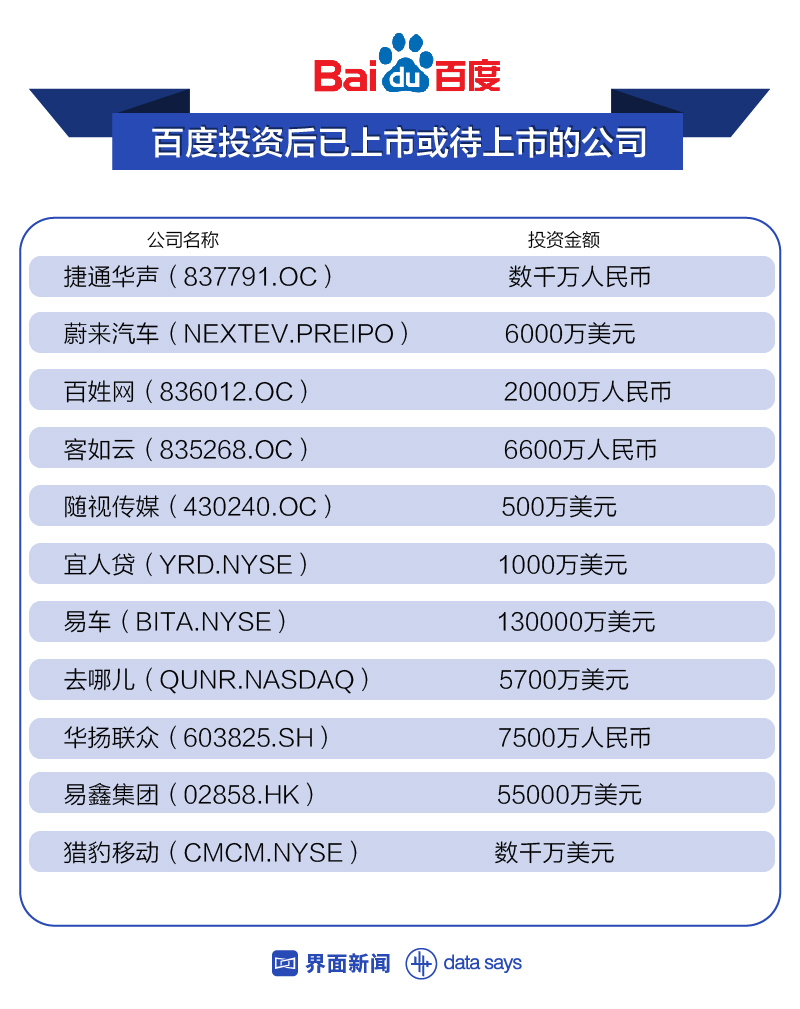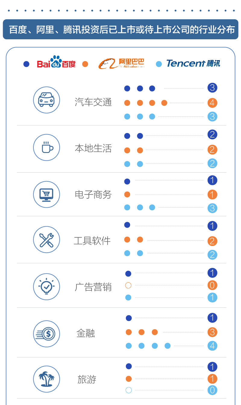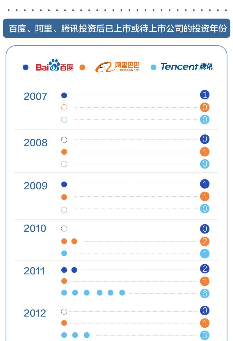 IT桔子数据显示,百度的134笔投资中有11家公司已上市或待上市;阿里的296笔投资中有22家公司已上市或待上市;腾讯的483笔投资中有28家公司已上市或待上市。虽然百度的投资事件数量和已上市或待上市的公司数量最少,但投资后上市的公司比例最高,而阿里、腾讯依次排行其后。
