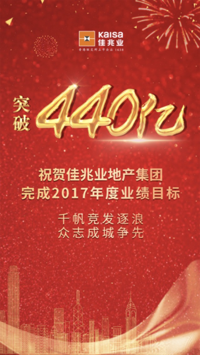 奋斗与奇迹的2017即将过去,佳兆业以圆满的成绩单迎接2018的到来。截至12月29日,佳兆业集团2017年累计合约销售突破440亿元人民币,顺利实现上调后的全年目标。