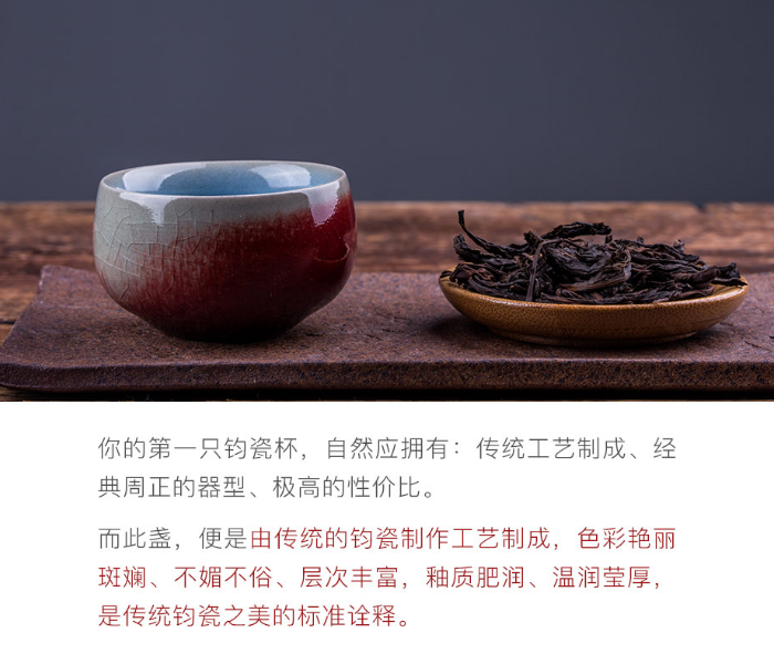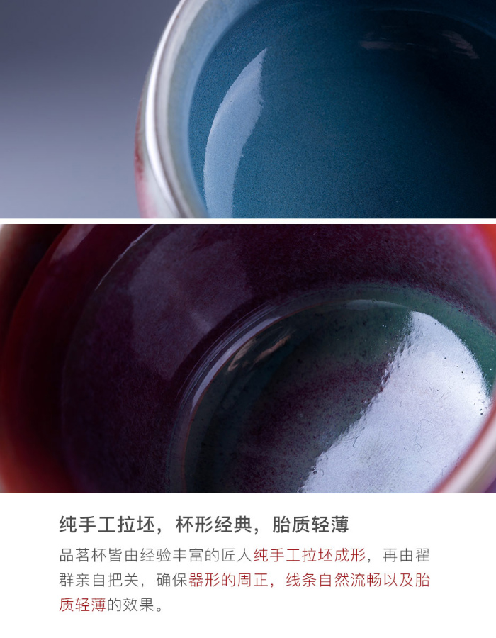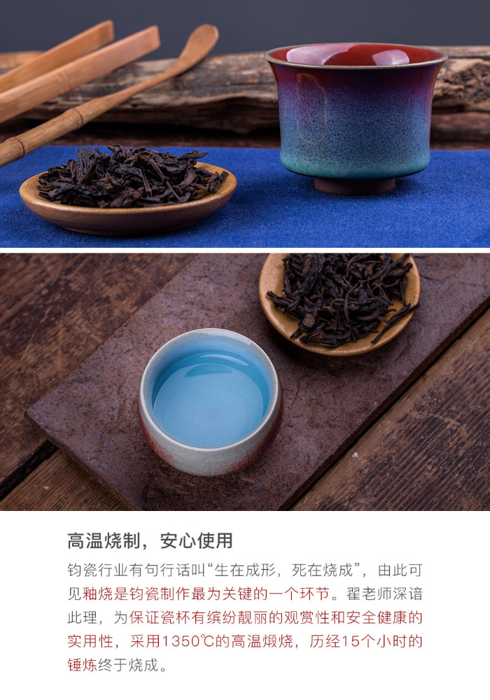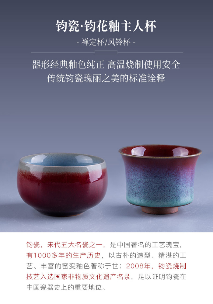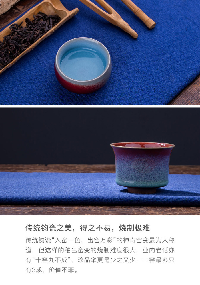 钧瓷是宋代五大名窑之一,以古朴的造型、精湛的工艺、丰富的窑变釉色著称于世。而这款钧瓷主人杯,是由从事钧瓷40余年非遗传承人翟群亲自把控出品,采用地道传统钧瓷工艺,手工拉坯,施以经典钧花釉,经1350℃高温烧制成瓷,色彩艳丽多变,意境无穷。