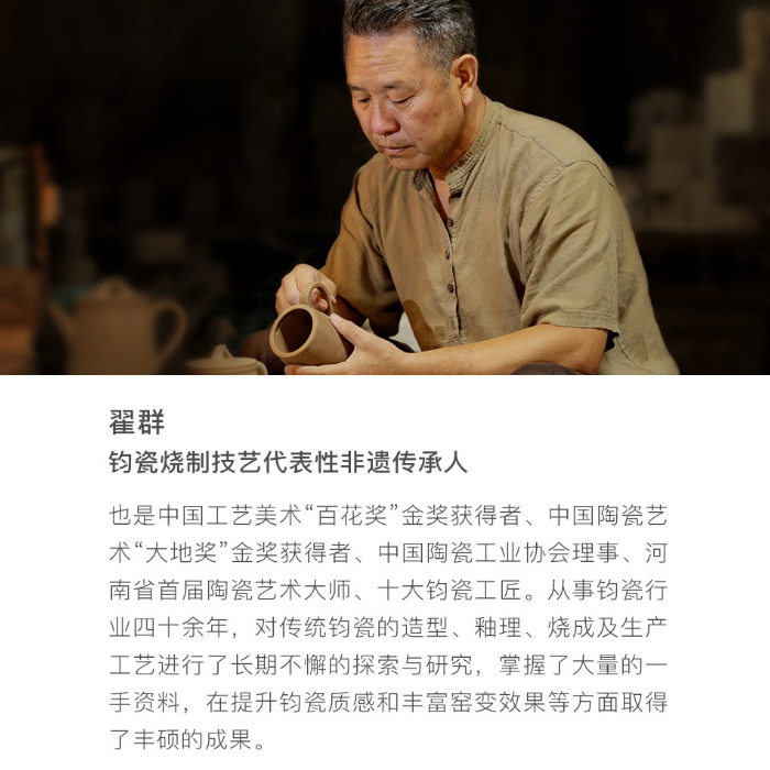 由从事钧瓷40余年非遗传承人翟群亲自把控出品,采用地道传统钧瓷工艺,手工拉坯。