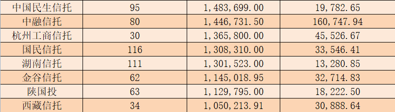 具体到单个信托产品发行情况,上述6357款公布成立规模的产品中,成立规模最大的是五矿国际信托发行的“环球1号财产权信托计划”,该产品实际募集金额高达201.2亿元。紧随其后的是华润深国投信托发行的“兴赢1号财产权信托计划”,该计划实际募集金额也高达150亿元。除此之外,还有来自光大兴陇信托发行的“融盛8号集合资金信托计划”,其实际募集金额也达到了132.1亿元。