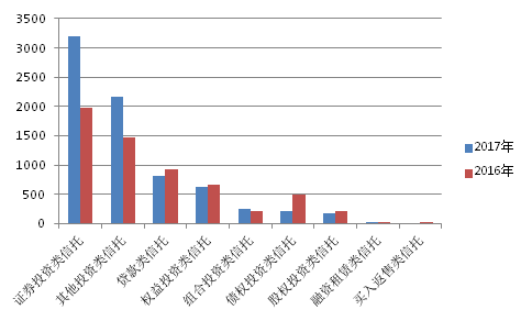 相比2016年,各类信托成立数量情况有所分化。其中,证券投资类信托、其他投资类信托以及组合投资类信托成立数量均呈现出增长态势,分别同比增长61.71%、46.99%以及13.24%;而债权投资类信托、贷款类信托、股权投资类信托以及权益投资类信托均有不同程度下滑,分别同比下降58.18%、12.42%、12.25%和7.31%。