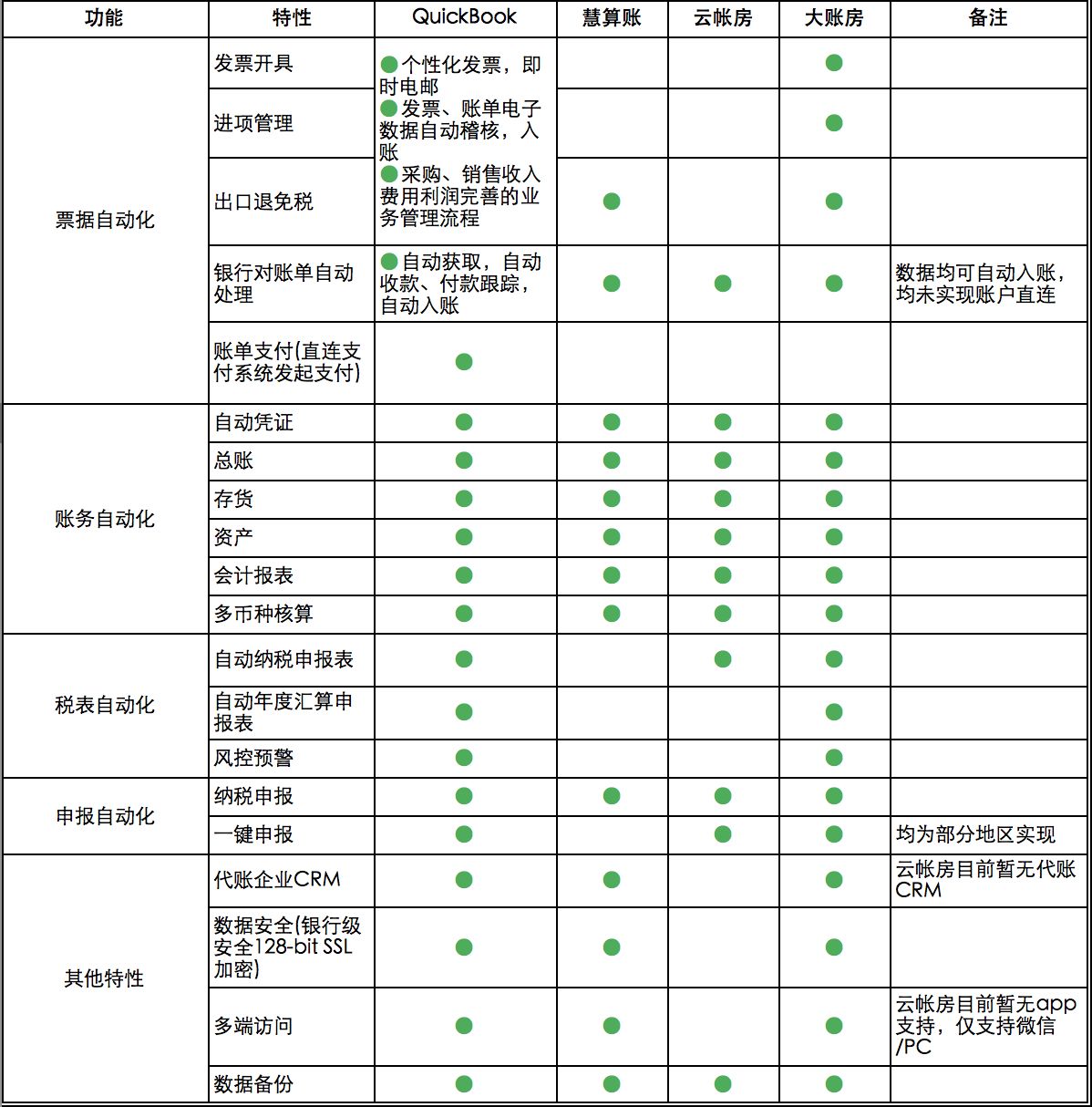 营改增带来了智能财税的机会,QuickBooks智能化、自动化、一体化实现自动化票据、自动账务、自动税表、自动申报的流畅应用模式在北美以及全球其他区域的巨大成功,必然成为国内智能财税初创公司竞相模仿的标杆,从以上分析可见,上述实力初创公司均向财税智能化对标,产品涵盖了票、财、税,实现发票自动化、自动账务、自动税表、一键申报。慧算账以“简单财税”方式,打造营销型自营代账公司;云帐房以智能硬件发力纳税申报,并开始直客业务;大账房在票、财、税一体化方面产品均有竞争优势,综合实力强,并独有多项票据功能,正在全国布局会计工厂。各方在擅长领域均获得了一定的成绩。