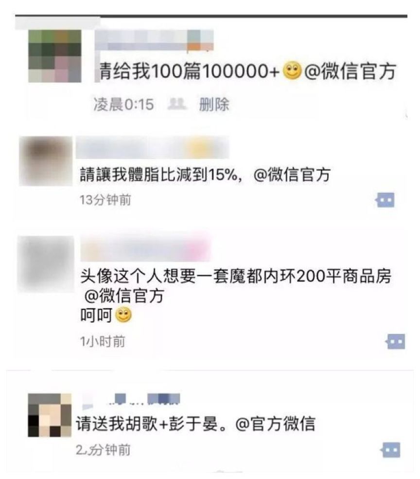 游戏规则——朋友圈编辑“给我一顶圣诞帽”@微信官网,微信头像即可戴上别具平安夜喜感的圣诞帽。即日,各路大小神龙进入帽子的狂欢,编辑口令一发不可收拾,有人@官微求男神女票、赐金银财宝,有人@官微恶搞逗捧、煞有介事。