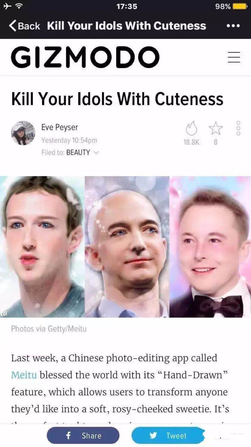新生代并不满足原滋原味的真人照片秀,于是乎各色美颜相机、APP受到追捧。例如,今年年初,扎克伯格、马斯克、希拉里、特朗普等被社交媒体玩坏了,罪魁祸首是美图一款“手绘相机”新功能。对比真人照片秀,美颜功能的照片秀更加符合年轻一代的胃口,自己照片上加上诸如流行的猫咪贴图等,以此体现个性和玩性的诉求。侵浸在泛娱乐的环境中,年轻一代审美需求的变化,展现更为理想和用户注意力已经转移到贴纸等新奇酷特效的基础上,对视频清晰度和实时美颜效果要求越来越高。