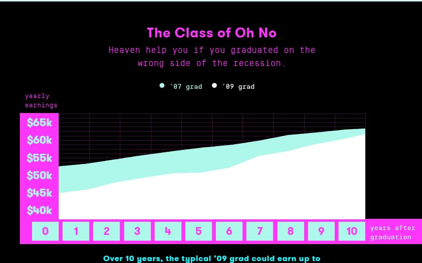 因为据统计,2007年的高校毕业生尚有一半多走出校门后就能就业,可到了 2009 年,这样的“幸运儿”就只有不到 20% 了。此外,2010 年的某份报告还显示,失业率每上升1%,当年毕业之人的就业起薪就要下降6%——8%,而这种颓势将延续数十年之久。同时该报告还表明,那些在1981年前后大衰退期间毕业的人们,跟十年后才毕业的人们相比,几十年来的平均收入一直处于下风,直到2010年还是如此。“每次经济衰退都会坑得一批人再也爬不起来。”哈佛大学经济学教授斯普里格斯如是说。