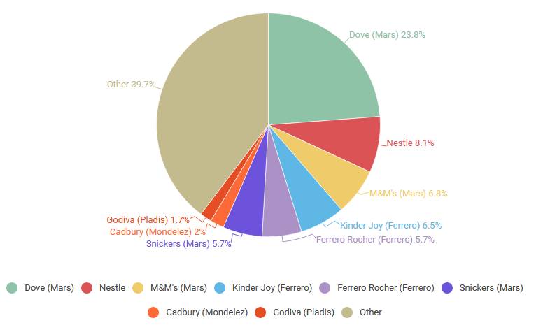 自2013年以来,玛氏在中国的巧克力糖果市场的份额一直在下滑,但在2017年,受益于多个成熟品牌(包括德芙、M&M’s,士力架,和麦丽素)的增长,公司的多个产品线在不同的消费群体中成功地保持着领先地位,共占据了36.7%的中国市场份额。5大糖果巨头公司,包括玛氏、费列罗、雀巢、好时和亿滋,共占据国内巧克力糖果销售额的66%。