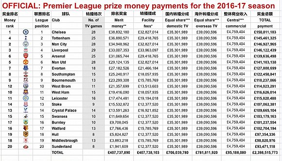 切尔西的收入增值主要源自英超冠军带来的巨额转播分成。2016-17赛季,蓝军在时隔两年之后再度加冕英超桂冠,这也是球队在英超时代的第五座联赛冠军。而根据英超官方给出的奖金分成数据,切尔西在当赛季收获了3282万的转播提成、3530万的国内转播分成以及3910万的海外转播分成,在转播方面共收入1.07亿英镑。
