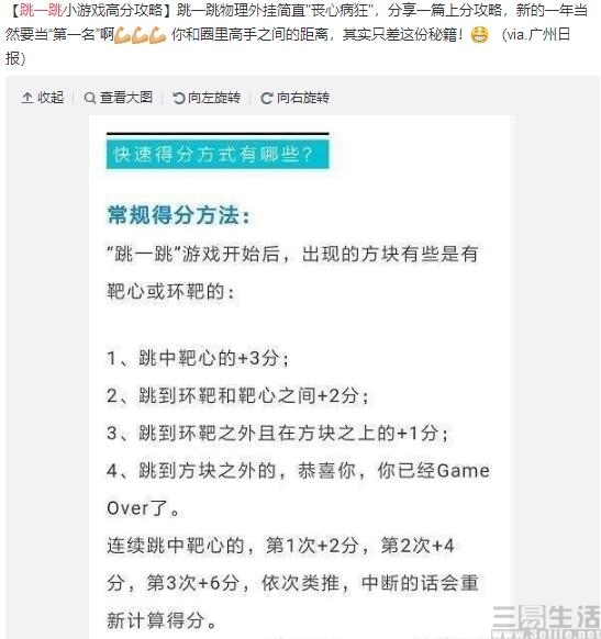 因为刚好在元旦假期之间强推,加之游戏也算是老少咸宜,【跳一跳】迅速在朋友圈爆火,许多玩家为了能在朋友圈里拿到更高的分数各种钻研快速得分的方式。比如说有网友就发现了,跳中靶心往往得分较高,还有的网友发现凡是跳到“污水井盖”“魔方”“士多店”“唱片机”上,停留2秒钟则有额外加成可助你获得高分。甚至有网友经过不断反复试验后发现,如果按住屏幕上的棋子,向下一个方向匀速滑动,只要找准了手指的运动速度,几乎可以一直玩下去——因为你的手指已经在实时地帮棋子测算好距离了。
