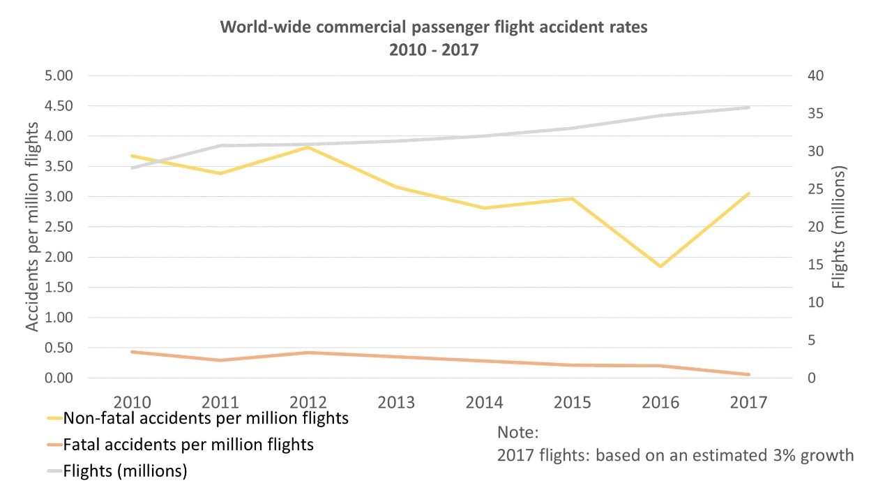 根据坠机事件追踪网站航空安全网(Aviation Safety Network)于2018年1月1日发布的统计报告,在2017年全年共计约3680万次飞行中,分别发生了5起客机和5起货机事故,共致44名机上人员和35名地面人员死亡;同时以整年计算下来,民航事故死亡率为平均每736万次飞行有一名乘客死亡。这样的数据不仅大大低于2016年的数据,另外对比各项指标后,航空安全网称2017年为“最安全一年”。