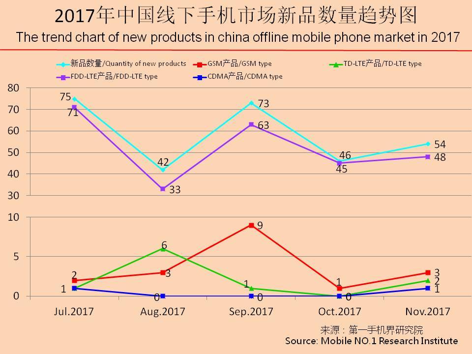 2017年11月,中国大陆手机线下市场共有54款新品推出,包括1款CMDA 1X,3款GSM、2款TD-LTE和48款FDD-LTE产品。