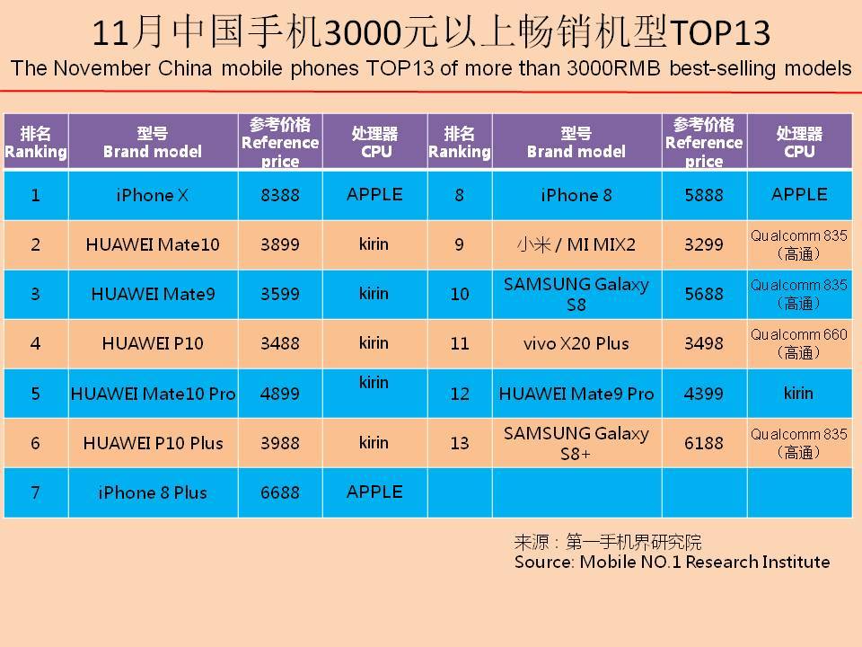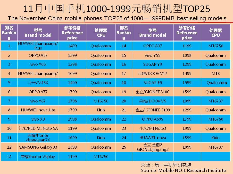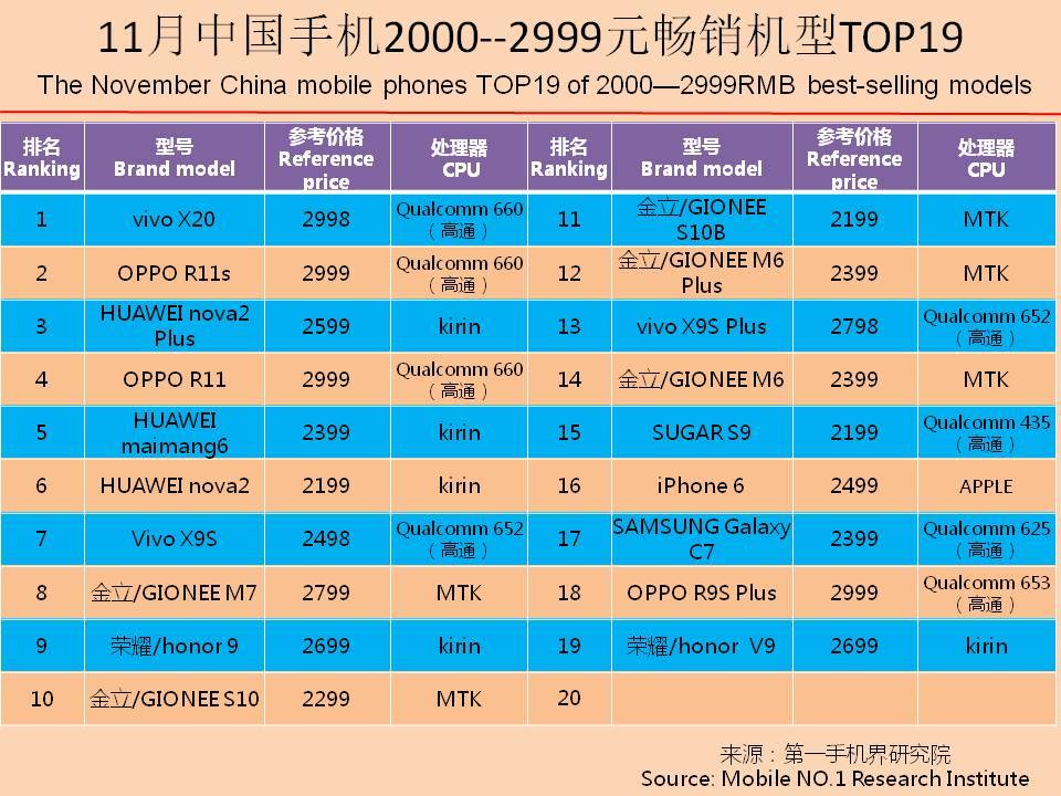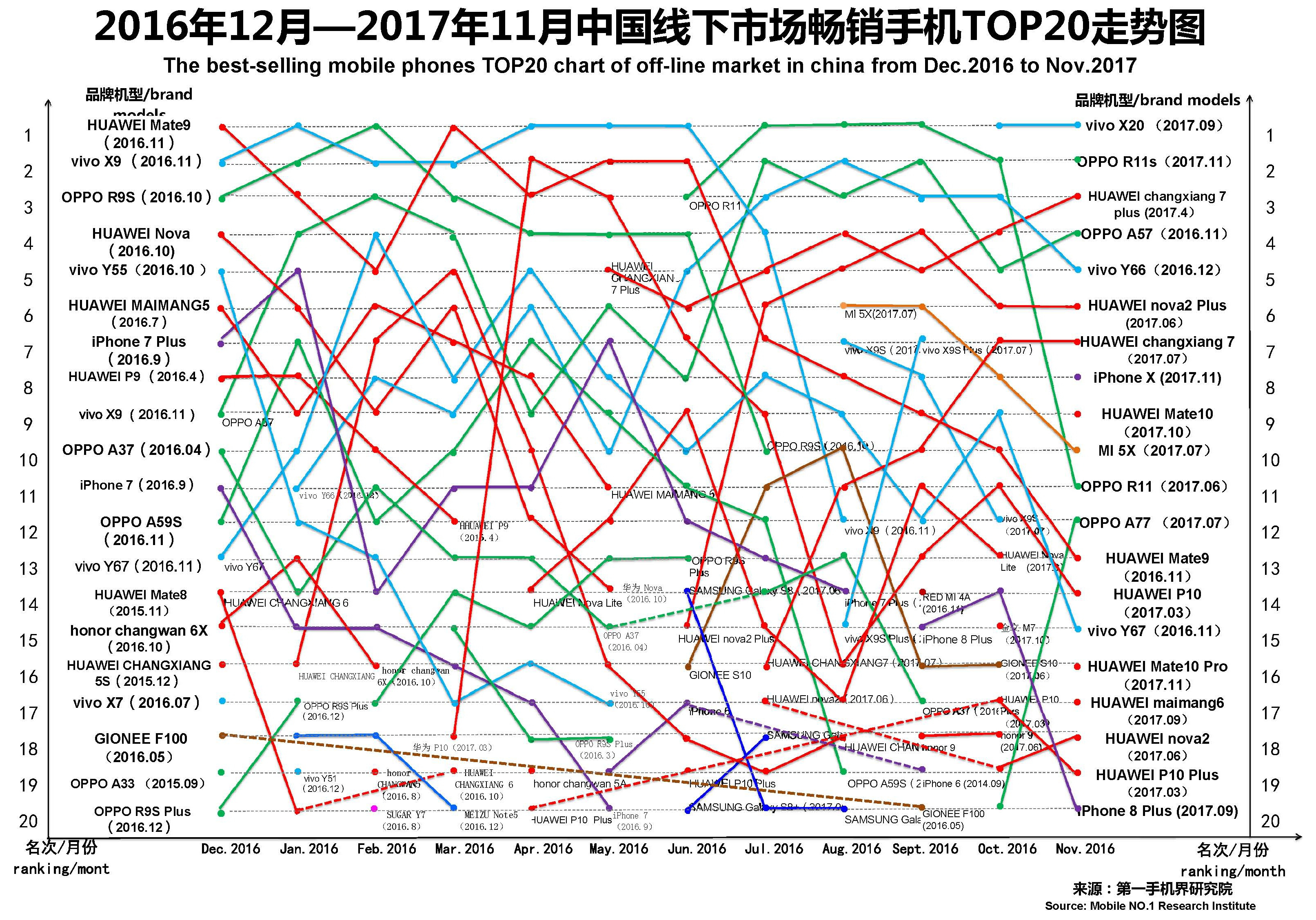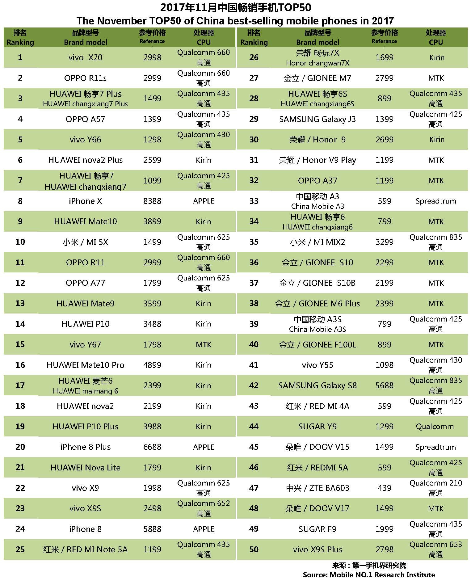 vivoX20、OPPO R11s、华为 畅享7 Plus、OPPO A57、vivo Y66、华为nova2 Plus、华为 畅享7、iPhone X、华为 Mate10、小米 5X成为11月中国畅销手机TOP 10。