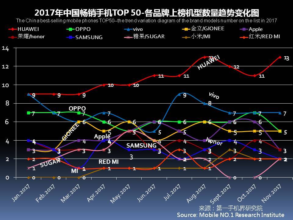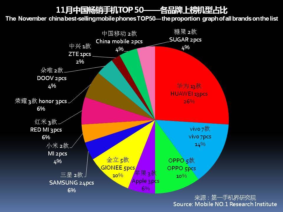 11月在中国大陆线下渠道走量的手机机型基本分布是,华为 15款、金立11款、vivo9款、OPPO 7款、荣耀5款、苹果4款、三星4款、糖果4款、朵唯4款、小米3款、红米3款、中国移动3款、中兴2款、至尊宝、佰灵通、青橙各1款。