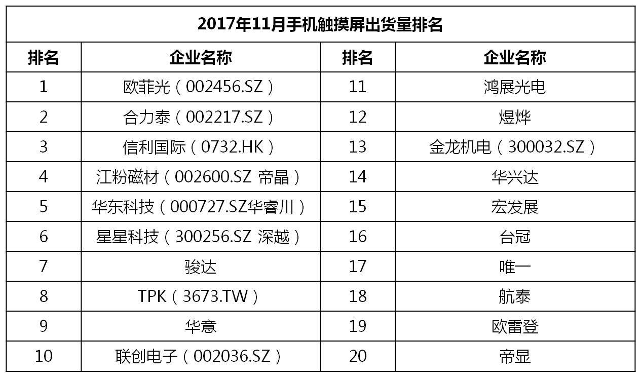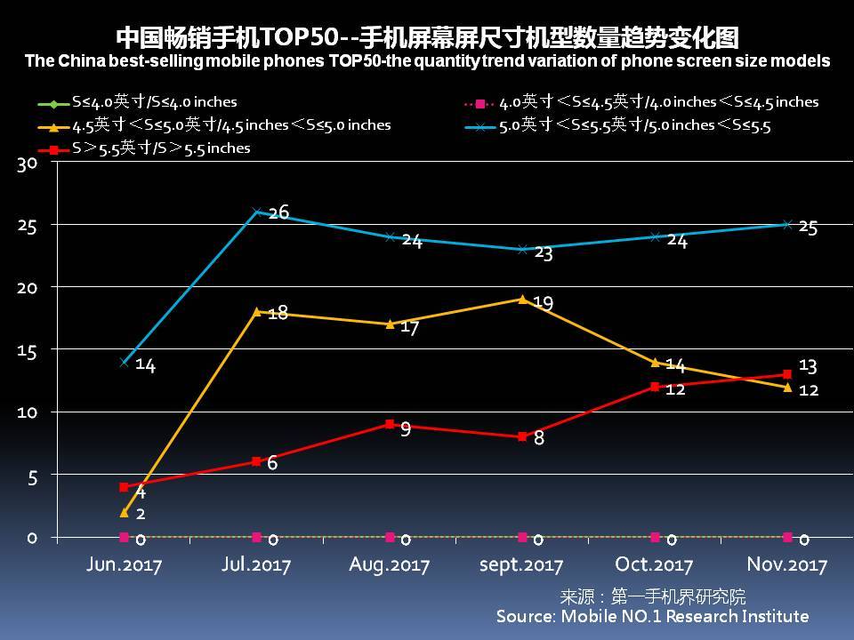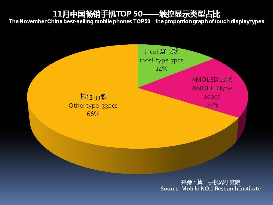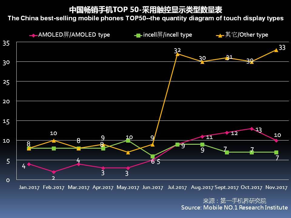 11月中国畅销手机TOP 50中,采用AMOLED屏达10款,说明全面屏已开始取代AMOLED成为手机卖点。