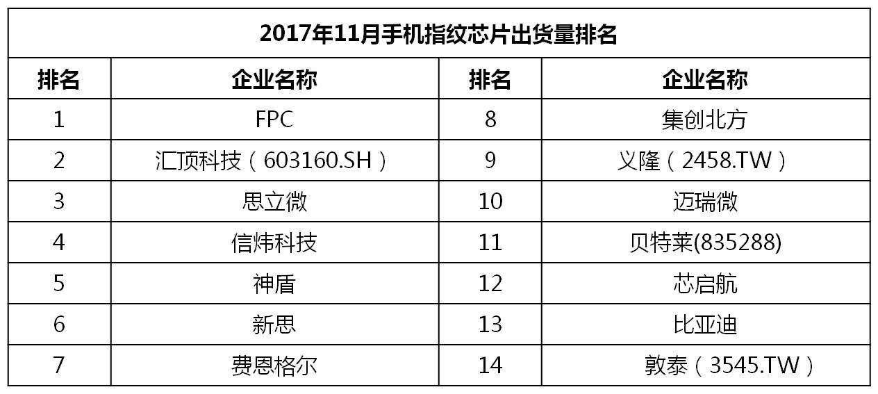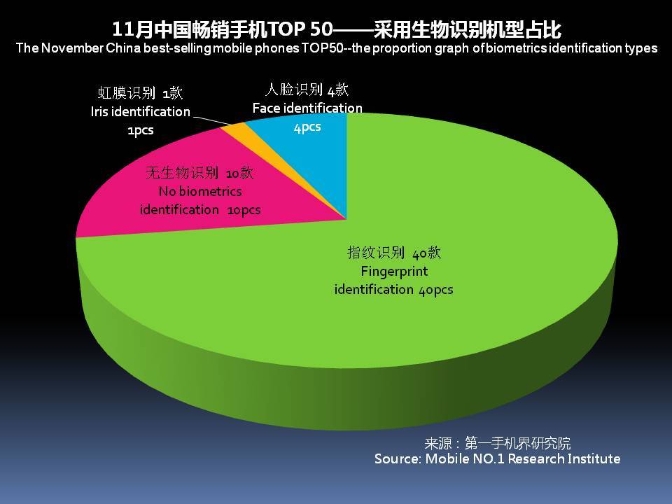 11月中国畅销手机TOP 50,采用指纹识别功能的手机有40款,占比80%;采用虹膜识别有1款,占比2%;采用人脸识别有4款,占比8%,没有采用生物识别功能的手机有10款,占比为20%。
