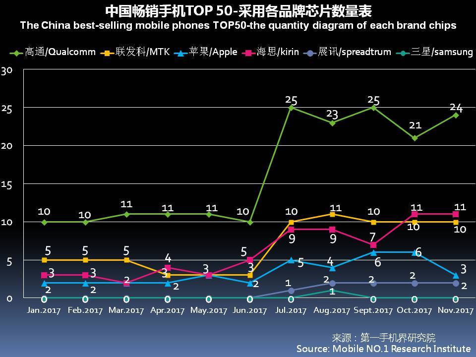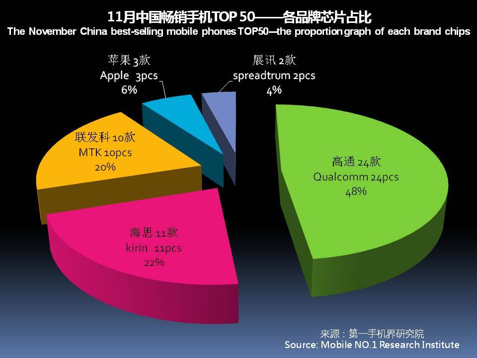 11月中国畅销手机TOP 50中,采用高通芯片的有24款,联发科(MTK) 10款,海思11款,苹果3款和展讯2款。高通芯片占有率达48%的份额。