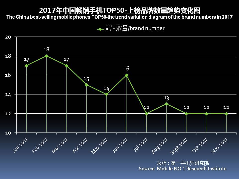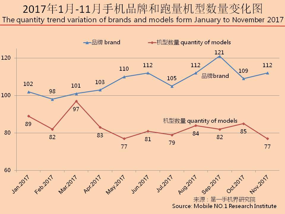 根据七星手机连锁、话机世界、广西王者通讯、四川龙翔通讯、广东丽的通讯、广东新星源手机数码连锁、黑龙江省凌志手机连锁、海南王者天创、山西太通科技、山西远大通讯、湖南齐欣通讯、江西丽华通讯、湖北九鼎通讯、吉林天天手机、云南九机网、甘肃悦达、陕西中人、河南兄弟通讯商会、河南国宇、河南胜天、江苏国网、河北润德、厦门中桥、迪信通、贵州诚讯、华伟通讯、大地通讯、重庆祥佳音、河北国通等全国手机连锁卖场销售数据统计结果显示,2017年11月在中国线下渠道销售的手机品牌达到112个,环比10月109个,增加了3个;11月有一定销量的手机机型达到77款,环比10月85款,减少了8款。