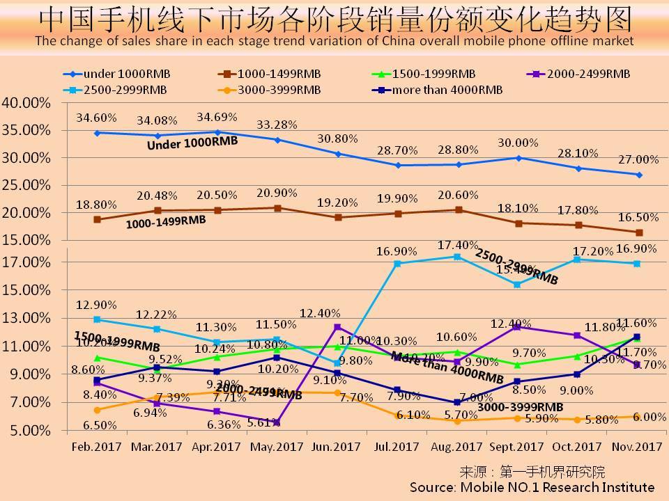 从中国手机线下市场各价格段销量份额变化趋势图可以看出,1500元以下的手机市场份额趋势还在继续走低,历史最低似乎还在“明天”。