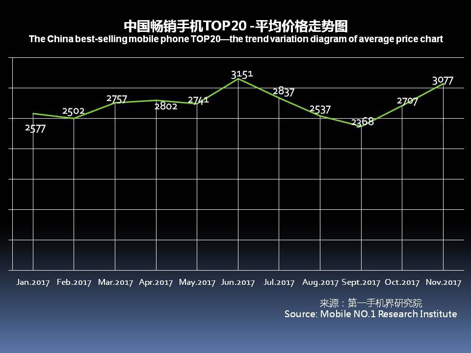 20款畅销手机平均价格在3077元,环比10月2707元,上升了13.7%。