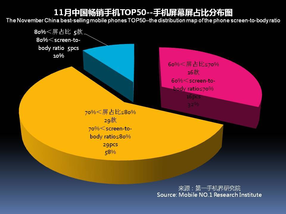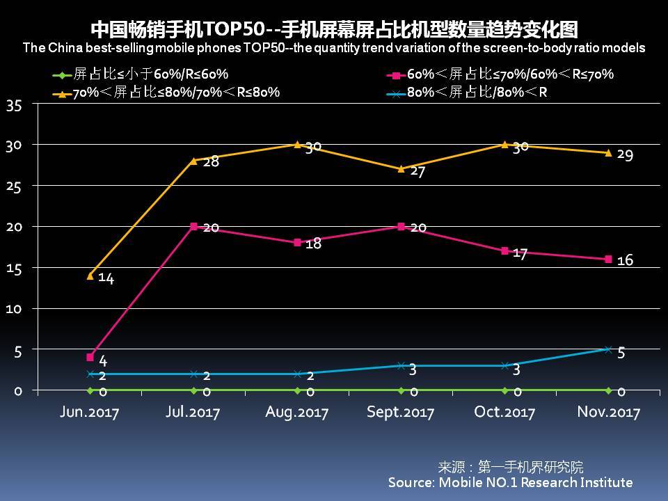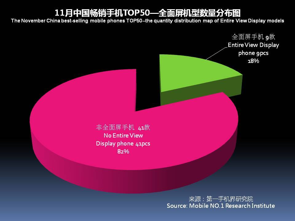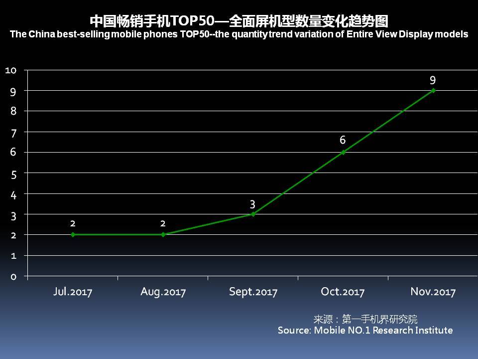 11月中国畅销手机TOP 50的全面屏手机上升至9款,分别是vivoX20、OPPOR11s、iPhone X、华为 Mate10 Pro、华为麦芒6、荣耀畅玩7X、金立M7、小米MIX2、三星Galaxy S8,比10月环比增加了50%。第一手机界研究院预计,到12月全面屏手机将超过12款。