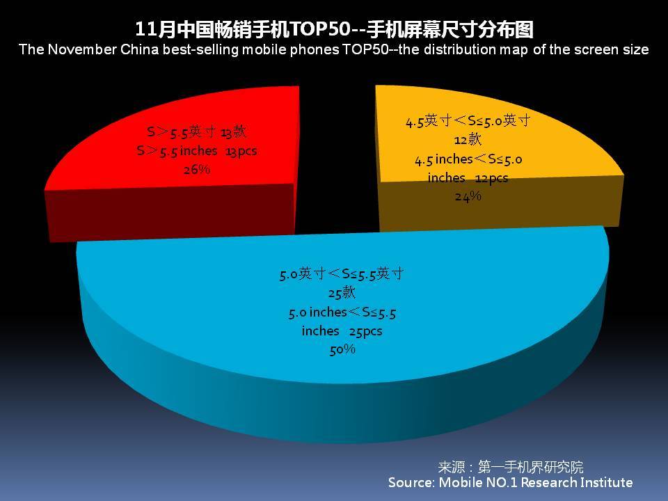 11月中国畅销手机TOP 50的手机屏幕绝大部分为5.0英寸-5.5英寸之间,占比达50%,但超过5.5英寸手机屏幕数量从10月的12款增加至11月的13款。手机屏幕屏占比在80%以上,有5款。