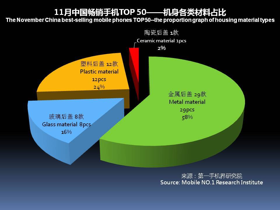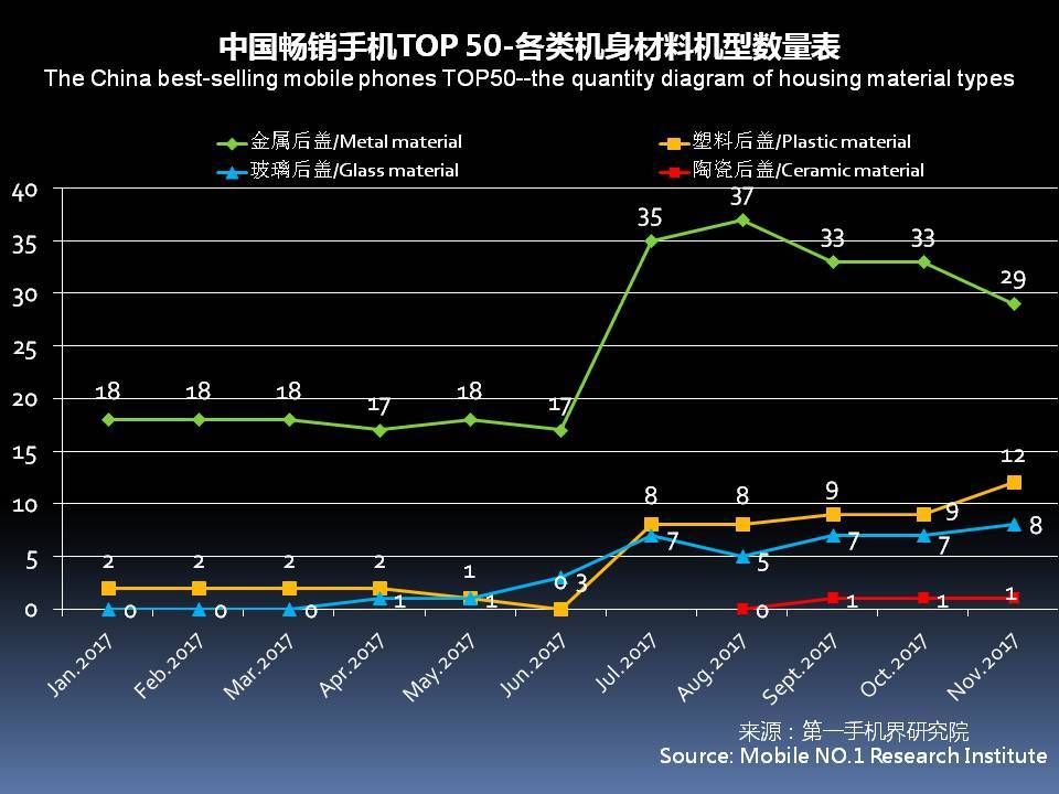 11月中国畅销手机TOP 50,采用金属后盖有29款,占比58%;玻璃后盖的有8款,塑料后盖有12款,陶瓷后盖只有1款,就是小米 MIX2。