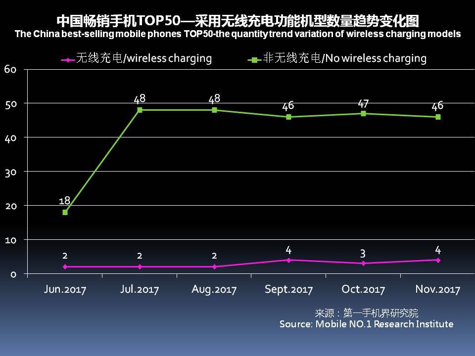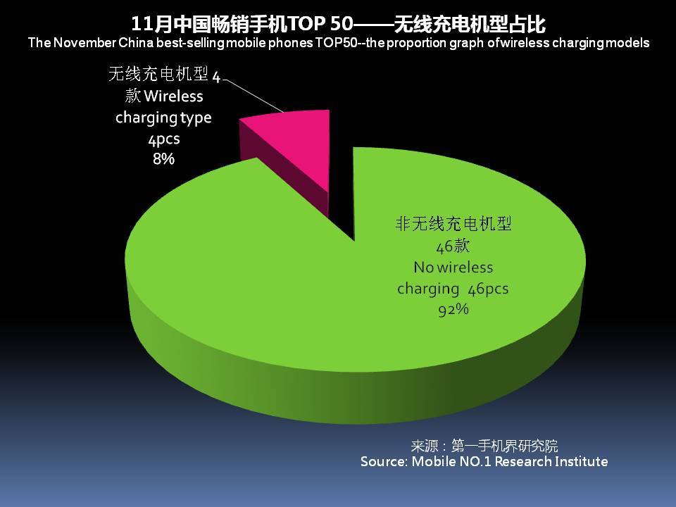 11月中国畅销手机TOP 50中,采用无线充电的机型有4款,占比8%,就是iPhone X、iPhone8 Plus 、iPhone8和三星 Galaxy S8。