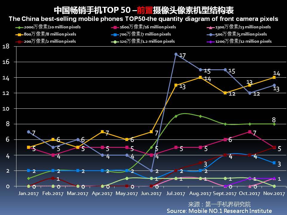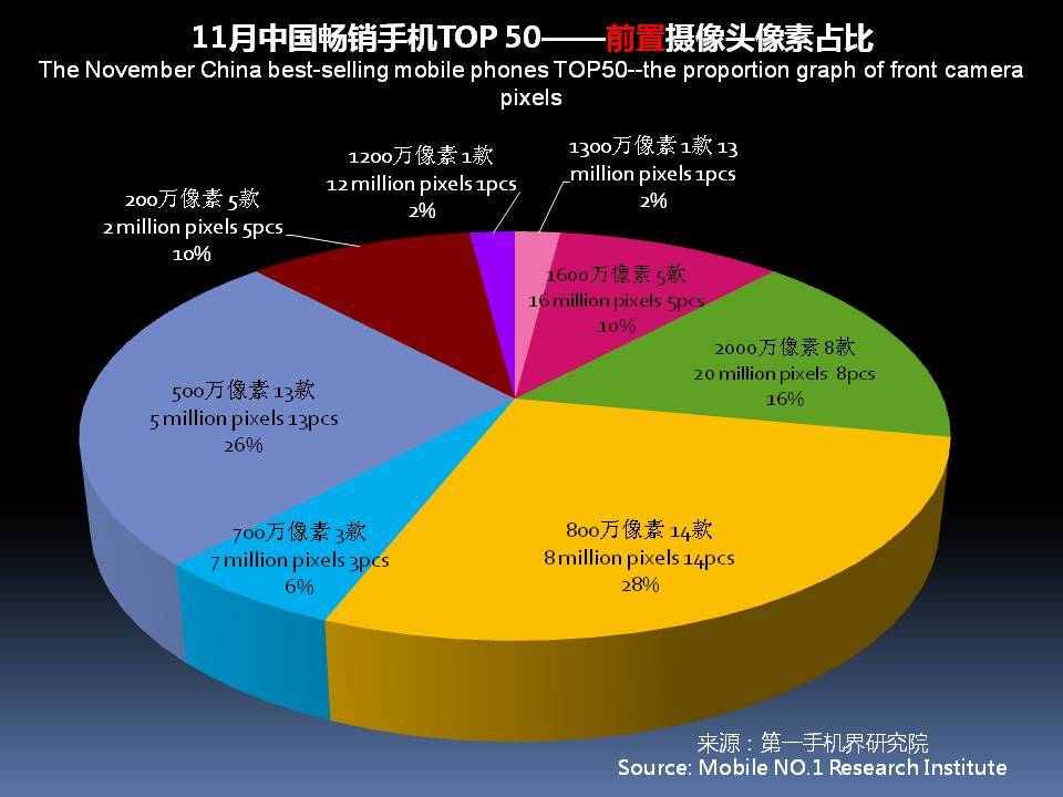11月中国畅销手机TOP 50中,前置摄像头采用2000万像素的有8款,占比16%;采用1600万像素有5款,占比10%。