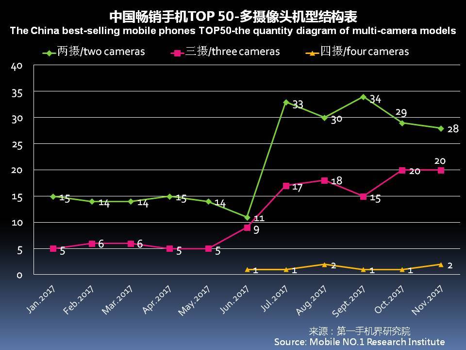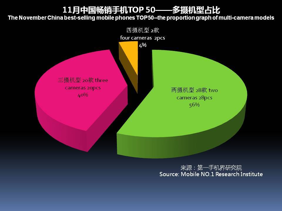 11月中国畅销手机TOP 50中,已有22款机型采用多摄像头设计,占比44%。