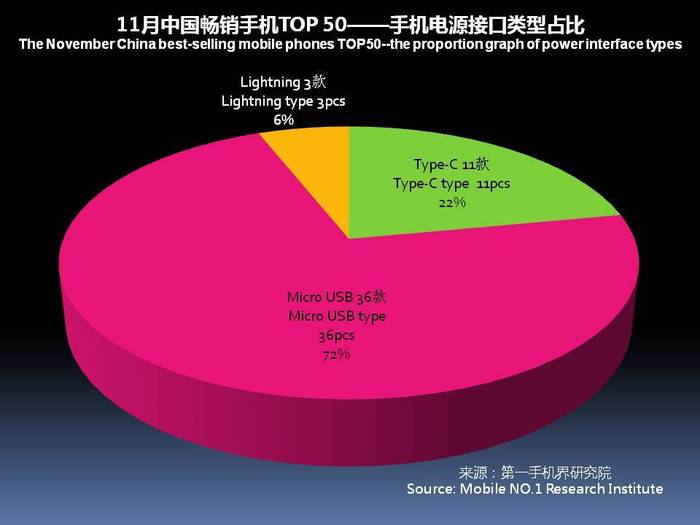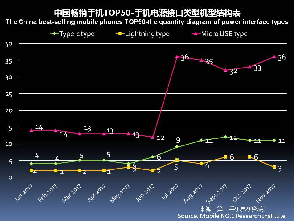 11月中国畅销手机TOP 50中,采用Type-c接口的机型已达到11款。