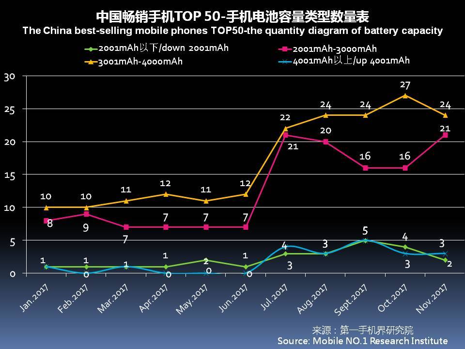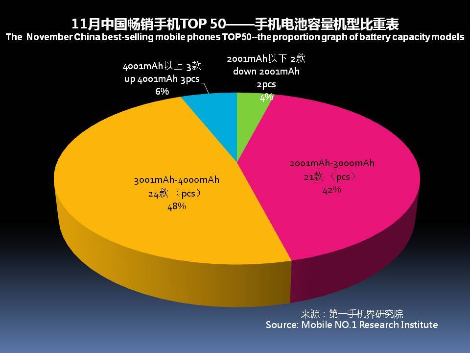 续航能力已经成为手机卖点之一,11月中国畅销手机TOP 50中,电池容量3001mAh-4000mAh的机型数量已达到24款。