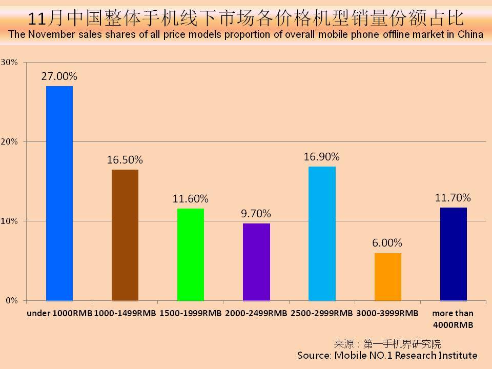 11月中国畅销手机TOP 20,超过2000元售价的机型占13款;1500-1999元价格段机型占2款;1000元-1499元价格段机型占5款;1000元以下的机型占0款。