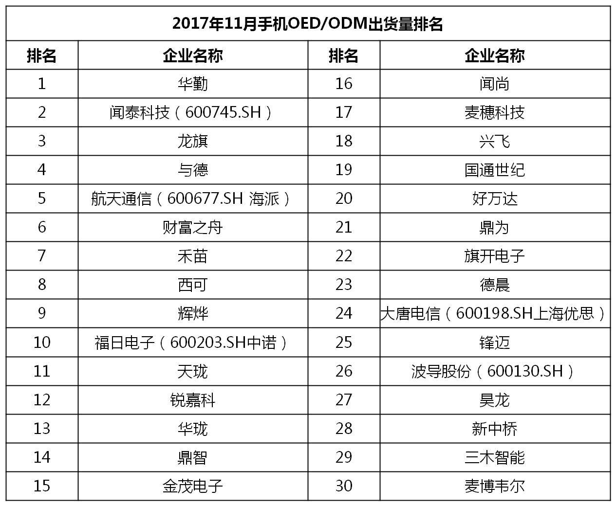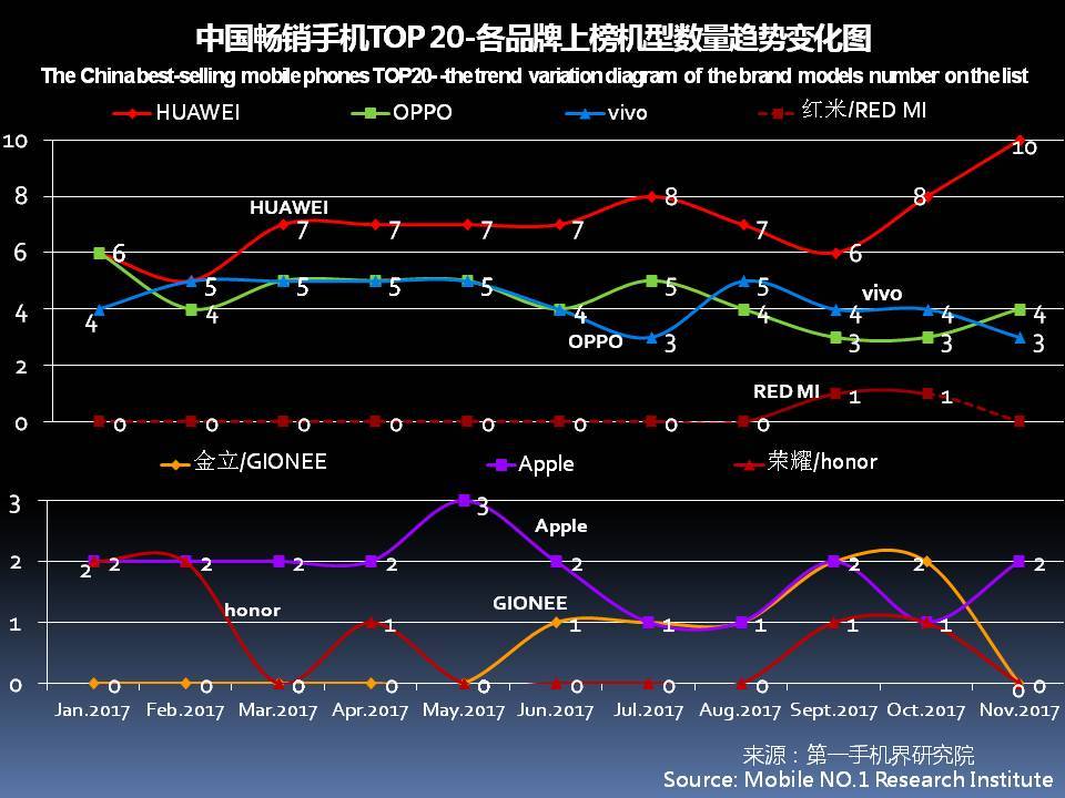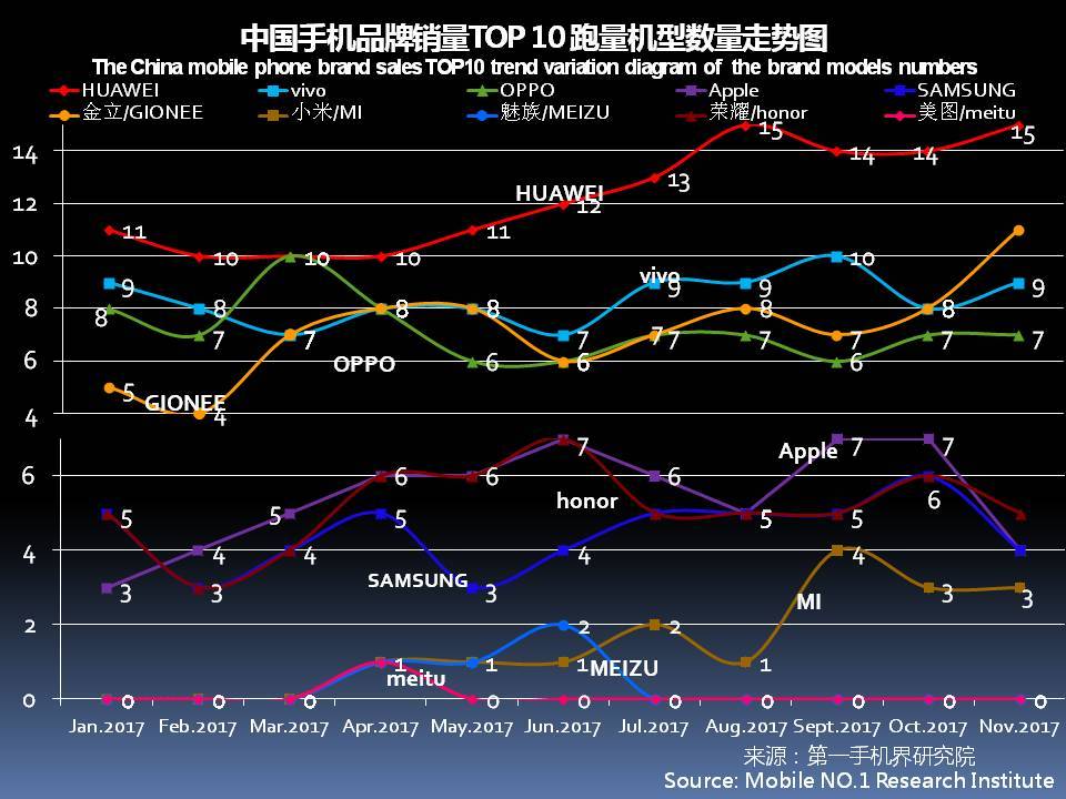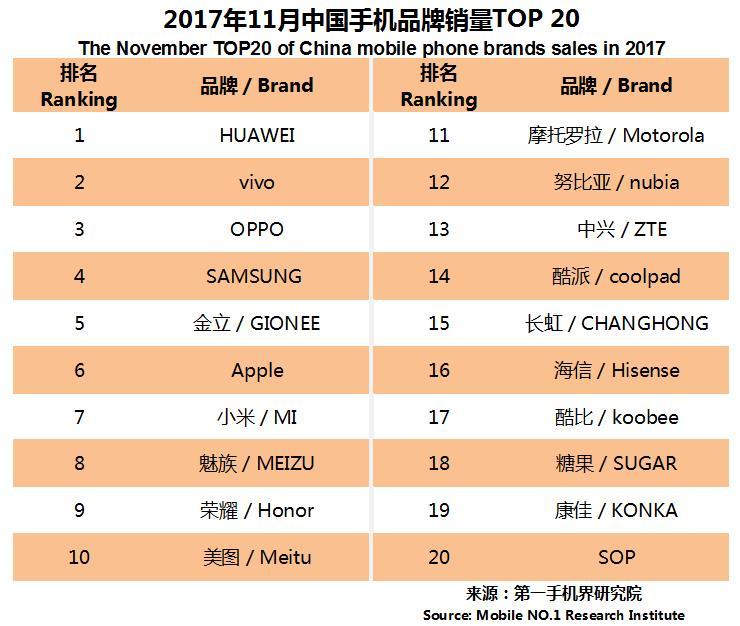 华为、vivo、OPPO、三星、金立、苹果、小米、魅族、荣耀、美图成为11月中国手机品牌销量TOP 10。