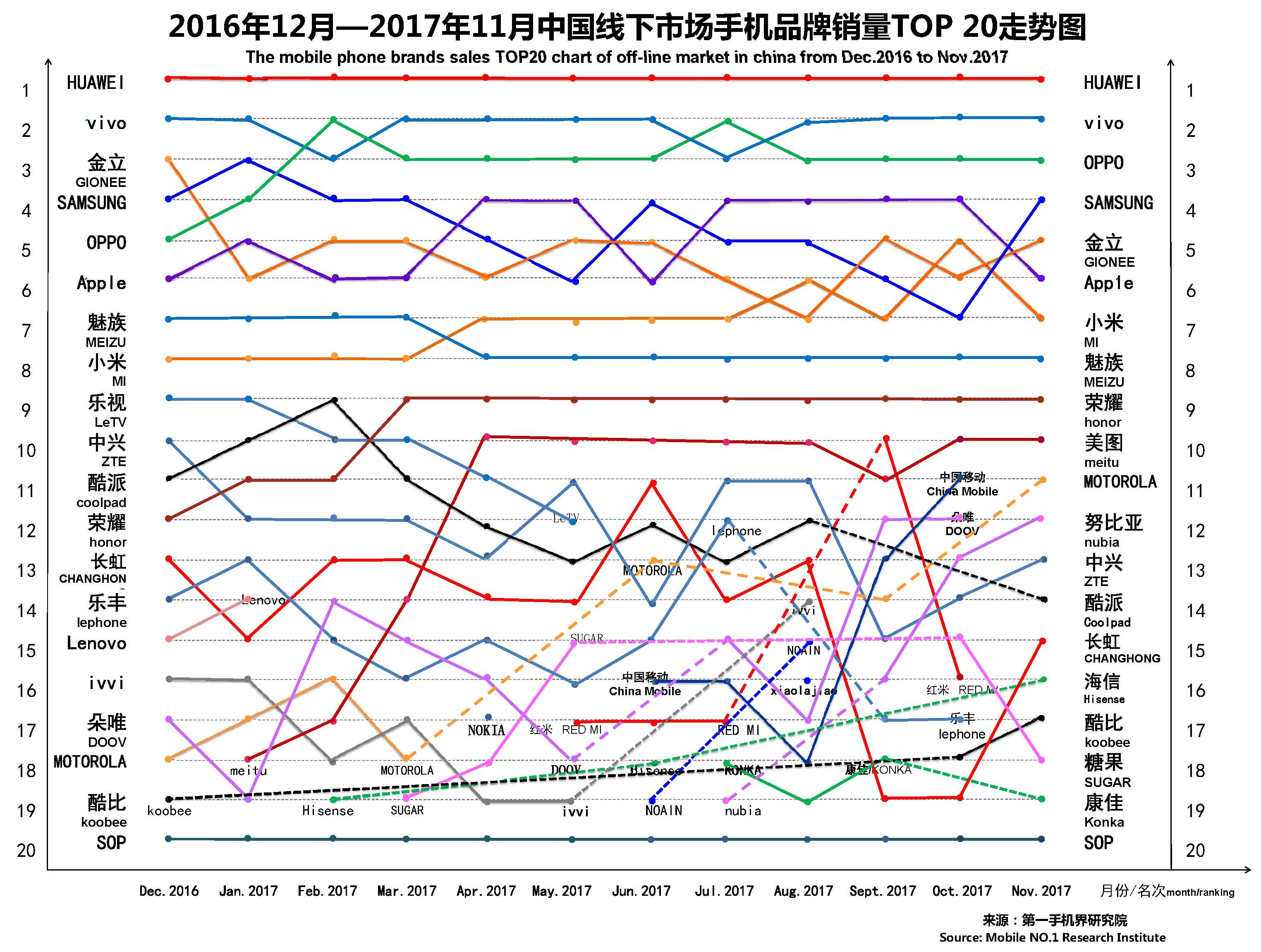 11月中国手机品牌销量TOP 20最大的变化是,小米、金立和三星处于争抢线下渠道的关键期,谁胜谁负似乎还很难定论。