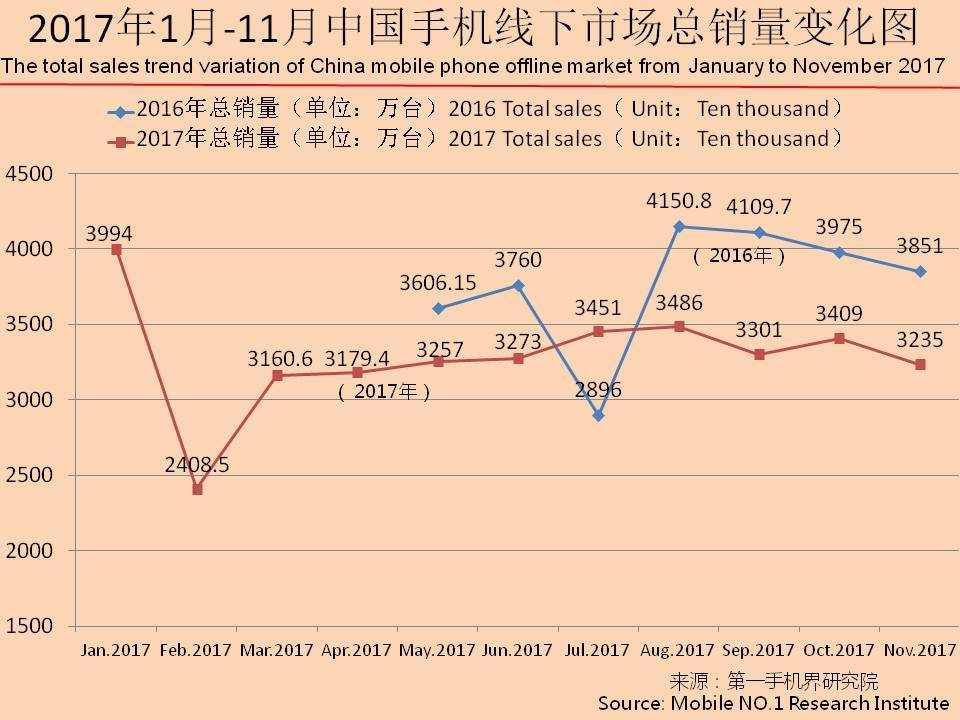 第一手机界研究院根据覆盖全国25个省/直辖市/自治区221个城市,10034家线下手机实体店的销售数据统计结果计算,2017年11月中国大陆整体手机线下市场共完成销量3235万台,同比减少16%,环比10月下滑了5.1%。