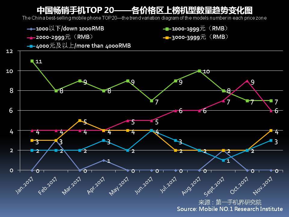 从中国畅销手机TOP20-各价格区上榜机型数量趋势变化图明显看出, 千元以下机型已基本无缘中国畅销手机TOP20。