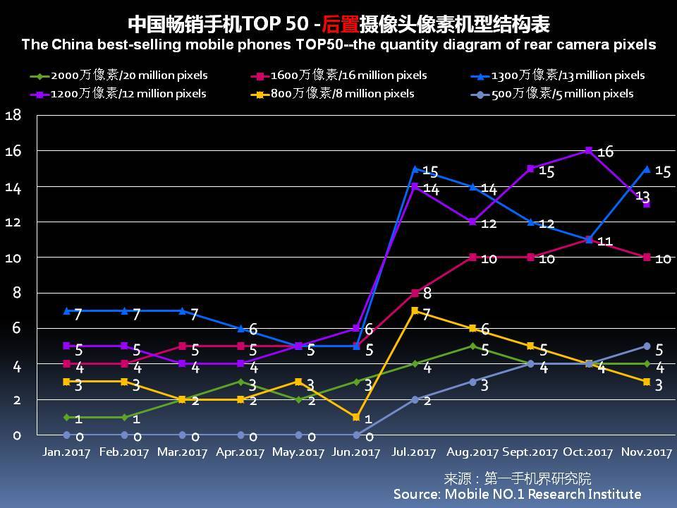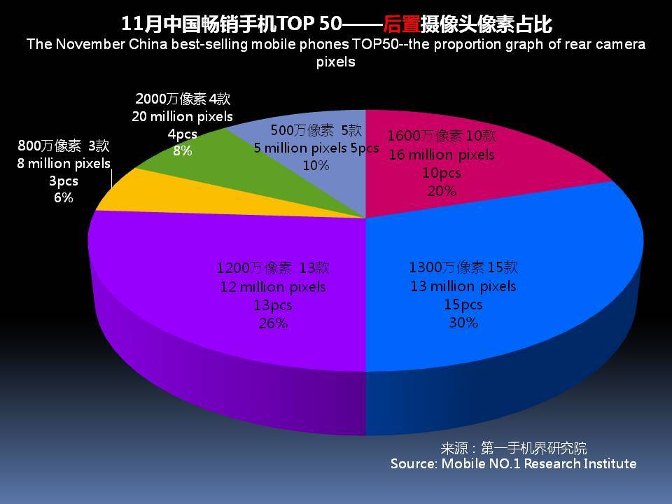 11月畅销手机TOP 50中,后置摄像头采用2000万像素的有4款,占比8%;采用1600万像素的有10款,占比20%。