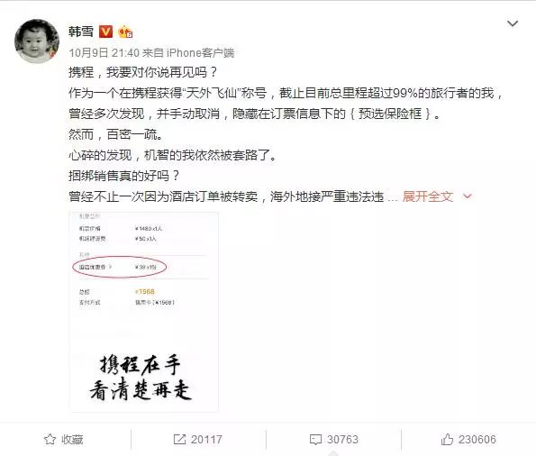 当月9日,明星大V韩雪微博吐槽携程的捆绑销售问题,再次将携程推向了舆论的风暴眼。