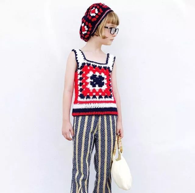 当然小萝莉也有着复古与个性的潮人一面。针织的贝雷帽和小背心搭配上条纹长裤,衣服黑色框架打造出完美的潮流cool girl来。