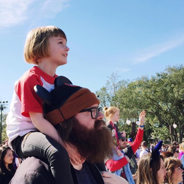 去游乐场把Olive背在肩上,甚至也会在Olive的要求下戴上孩子气的米老鼠的发卡。