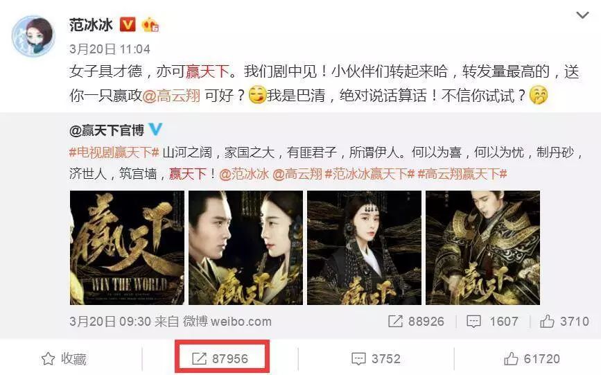 早在今年3月,范冰冰在微博转发《赢天下》官宣剧照之时,转发数便超过8万,截止目前电视剧赢天下官博粉丝数已超过16万。